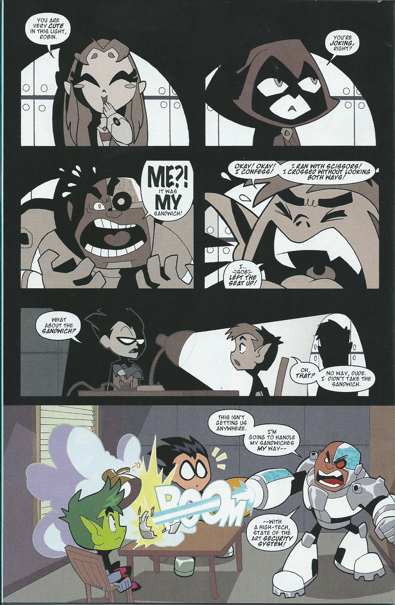 In the first story of Teen Titans Go! #1, Cyborg is determined to find out who keeps stealing his sandwiches out of the refrigerator. Here are a couple of my favorite panels from the story. Robin conducts his own investigation.