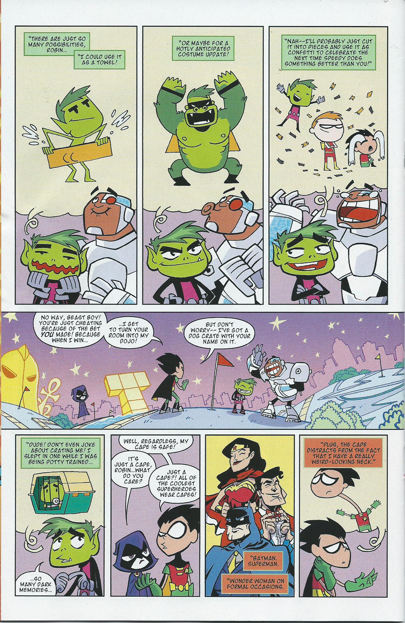 In the second story, Robin and Beast Boy make a bet on the mini-golf course, and Beast Boy is determined to win Robin’s cape. Cyborg instigates during the entire game. I mentioned the superb artwork earlier. I love the detailed facial expressions. Check out Cyborg’s expressions as he instigates the shenanigans between Beast Boy and Robin.