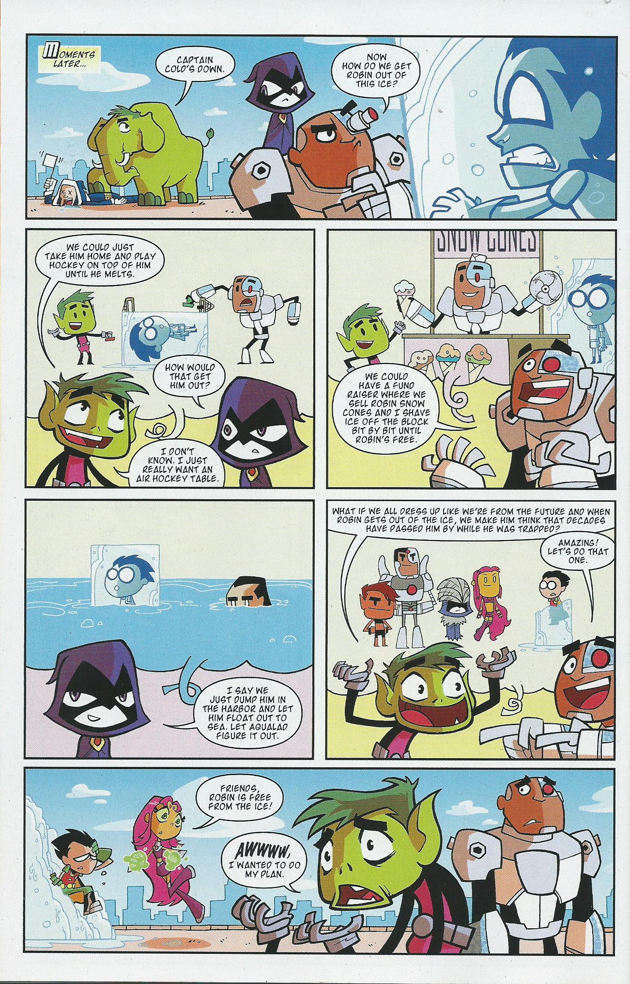 In the second story, Captain Cold blasts Robin into a block of ice. Now the team has to come up with ways to try to free Robin.