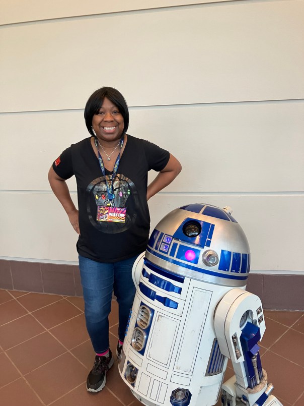 As with all comic conventions, there were cosplayers and all kinds of awesome props. And guess what? I got my picture taken with R2-D2! I was sitting in the concession area eating a snack when he came and stopped right next to me, lol. The owner of the robot asked if I wanted my picture taken with him. I was so happy, lol.